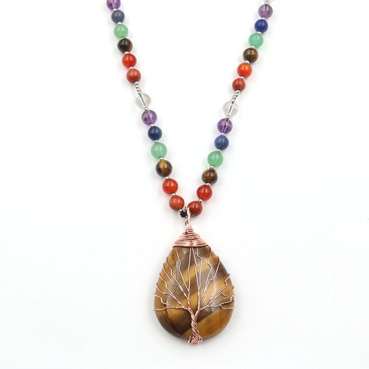 Natürlicher Tigerauge-Roségold-Wickelwassertropfen-Baum des Lebens-Anhängers Tigerauge-runde Perlen-Pullover-Kette