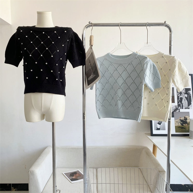 iamanten Argyle Strick Korean Pullover Frauen 2023 Sommer Kurzarm O-ansatz